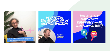 Concreet wil dat zeggen dat we de content al zoveel mogelijk in de campagnematerialen zelf aan bod laten komen. Bij de eerste edities waren die er vooral op gericht om het concept van de ‘maand zonder alcohol’ uit te leggen. Maar wie vandaag bijvoorbeeld een advertentie over Tournée Minérale op social media ziet, zal daarbij meteen al een inhoudelijke boodschap meekrijgen: informatie over alcohol en gezondheid of mentaal welzijn, of een filmpje waarbij we de vanzelfsprekendheid van alcohol onder vrienden of familie in vraag stellen.
