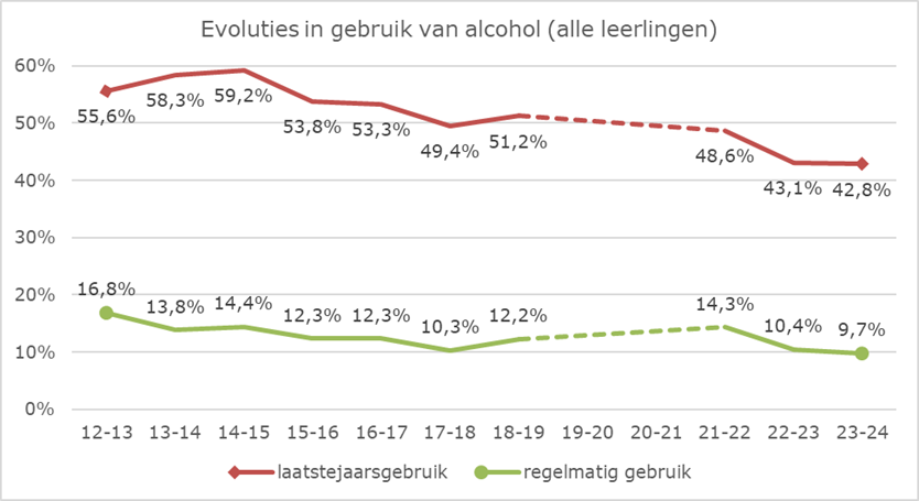 Over de tien laatste metingen heen bekeken tekent zich een duidelijke dalende trend in alcoholgebruik af. Het aantal leerlingen dat in de 12 maanden voor de bevraging alcohol dronk, daalde van 56% in 2012-‘13 naar 43% in 2023-’24. Het aantal leerlingen dat regelmatig dronk – minstens één keer per week – daalde zelfs met meer dan een derde (van 17% naar 10%). Ook goed nieuws wat de beginleeftijd betreft: die steeg in diezelfde periode van 14,0 jaar naar 14,8 jaar.