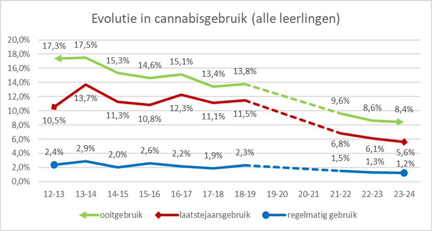 Tussen 2012-2013 en 2023-2024 dalen voor cannabis alle parameters. Zowel het aantal leerlingen dat ooit al cannabis gebruikte (van 17% naar 8%), als het aantal dat het afgelopen jaar gebruikte (van 11% naar 6%), als zij die wekelijks of vaker gebruiken (van 2% naar 1%).